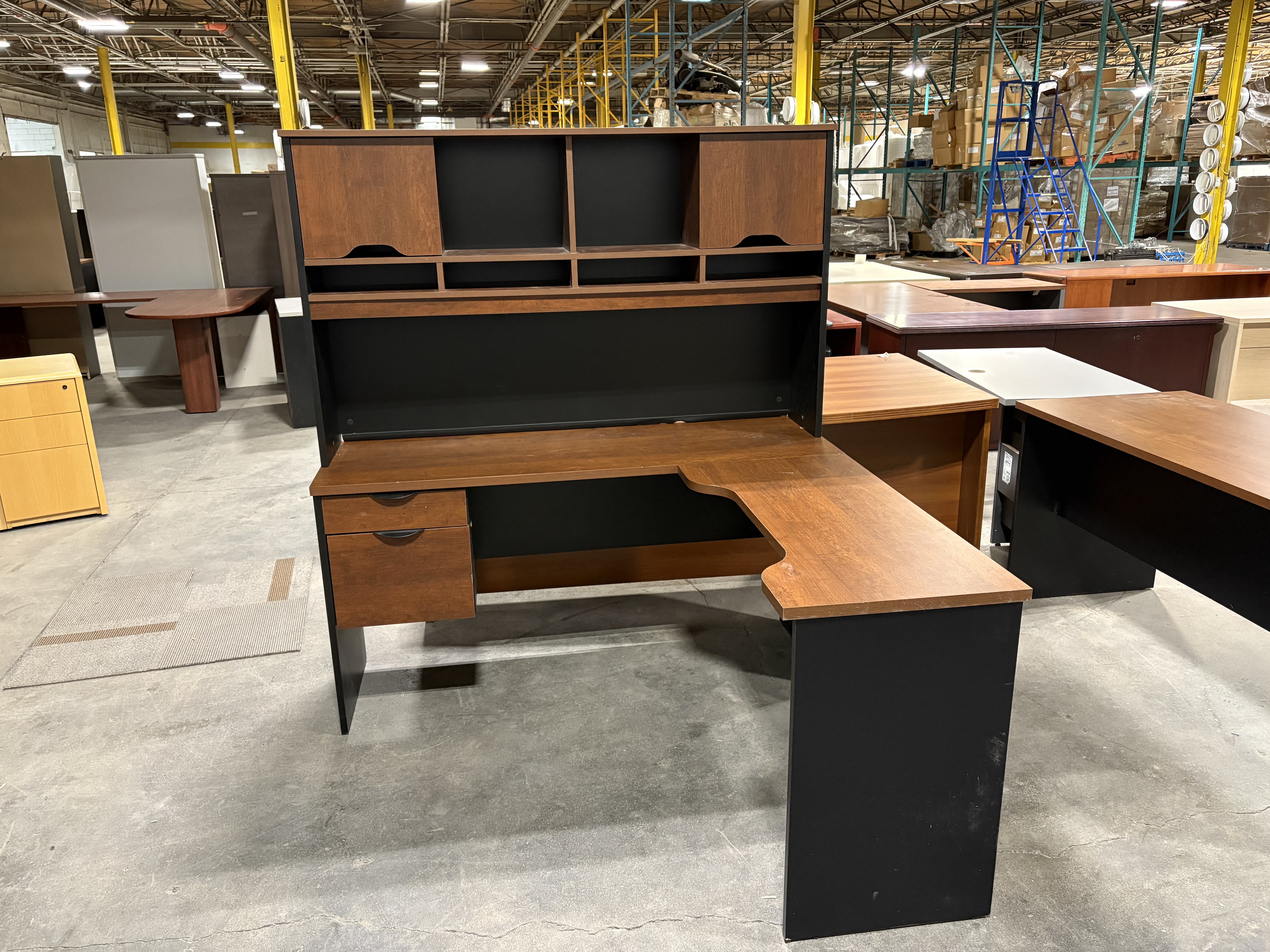 Brown And Black L-Shape Desk With Hutch